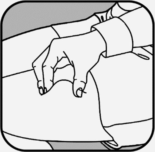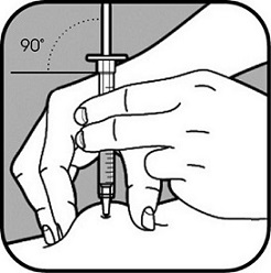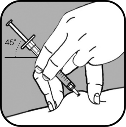 | Poista pienen neulan neulansuojus vetämällä se suoraan irti. Tartu ihoon niin, että peukalon ja muiden sormien väliin jää noin 5 cm leveä ihopoimu. Pidä ruiskua hallitsevan kätesi peukalon ja etusormen välissä. Neula on työnnettävä ihoon 45 asteen tai 90 asteen kulmassa. Terveydenhuollon ammattilainen näyttää sinulle, kumpaa kulmaa sinun pitää käyttää. |