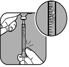 | Tarkista ruiskussa oleva neste ilmakuplien varalta. Jos havaitset kuplia, - pidä ruiskua pystysuorassa poistamatta neulaa injektiopullon sisältä,