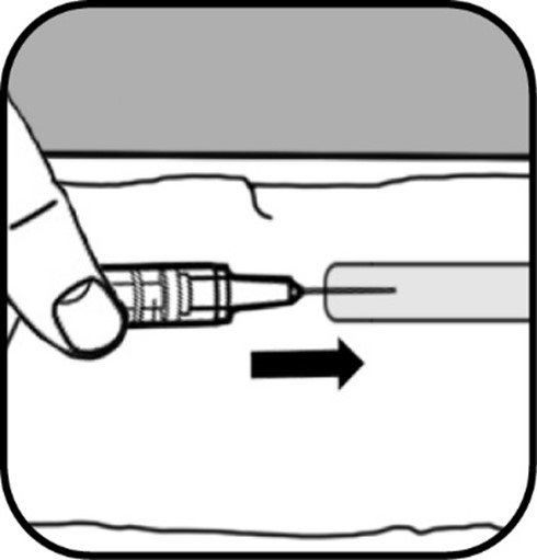 | Kun olet antanut koko annoksen, irrota neula vetämällä se varovaisesti suoraan irti ihosta. Päästä irti ihopoimusta. Paina pistoskohtaa vanutupolla tai harsotaitoksella muutaman sekunnin ajan verenvuodon tyrehdyttämiseksi. Kiinnitä tarvittaessa laastari. Älä hankaa pistoskohtaa. Vammojen välttämiseksi älä kiinnitä pienen neulan neulansuojusta takaisin neulaan. Aseta neula ilman suojusta teräville esineille tarkoitettuun jäteastiaan. |