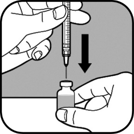| Pidä injektiopullo tasaista alustaa vasten. Työnnä iso neula hitaasti kumitulpan läpi injektiopulloon. Neulan kärjen ei pidä koskettaa injektiopullossa olevaa nestettä. Jos neulan kärki koskettaa nestettä, vedä neulaa hitaasti takaisin, kunnes kärki ei enää kosketa nestettä. Työnnä mäntä hitaasti ruiskuun. Tämä työntää ruiskussa olevan ilman injektiopulloon. |