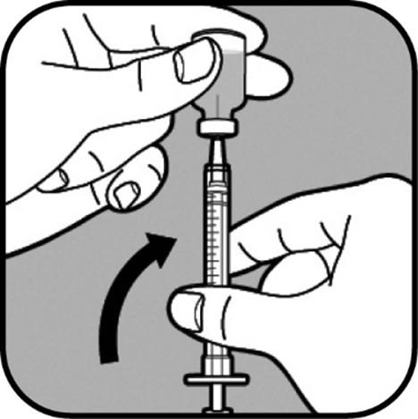 | Anna neulan olla injektiopullossa, ja käännä injektiopullo ylösalaisin. Varmista, että neulan kärki on nesteen pohjalla. |