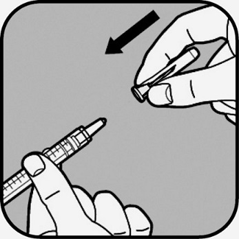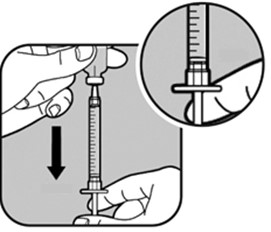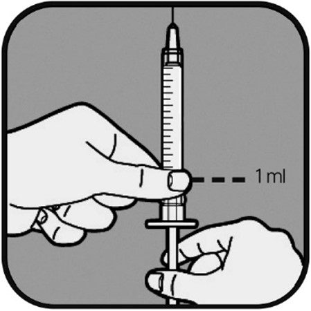 | Terveydenhuollon ammattilainen kertoo sinulle, kuinka paljon nestettä sinun pitää pistää. Määrä on normaalisti 1 ml kutakin pistosta kohden. Jos sinun on pistettävä vähemmän kuin 1 ml, terveydenhuollon ammattilainen näyttää sinulle, mitä merkkiviivaa sinun kuuluu käyttää. Käytä aina annostasi vastaavaa merkkiviivaa. Jos olet epävarma, tarkista ohjeet terveydenhuollon ammattilaiselta ennen käyttöä. Vedä ruiskun mäntää taaksepäin, kunnes männän pää on annostasi vastaavan merkkiviivan kohdalla. Tämä täyttää ruiskun ilmalla. |