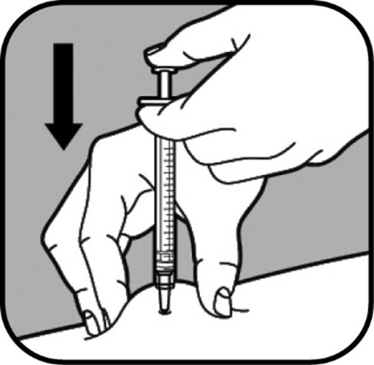 | Kun neula on ihossa, älä liikuta sitä. Jatka ihosta kiinni pitämistä. Työnnä mäntä hitaasti ruiskuun, enintään 30 sekunnin kuluessa, kunnes ruisku on tyhjä. |