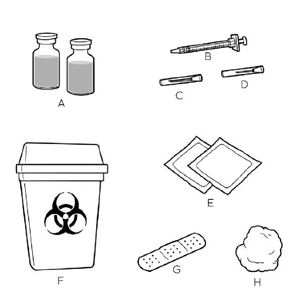 | Aseta kaikki tarvitsemasi tarvikkeet puhtaalle, tasaiselle alustalle. Kutakin pistosta kohden tarvitaan: A. CRYSVITA-injektiopullo pistosta (pistoksia) varten B. Yksi männällinen ruisku C. Yksi iso neula CRYSVITA-valmisteen vetämiseen injektiopullosta D. Yksi pieni neula CRYSVITA-valmisteen pistämiseen E. Alkoholipyyhkeitä F. Teräville esineille tarkoitettu jäteastia G. Laastaria (jos tarpeen) H. Harsotaitoksia tai vanutuppoja Ota yhteys terveydenhuollon ammattilaiseen, jos sinulla ei ole näitä tarvikkeita. |
