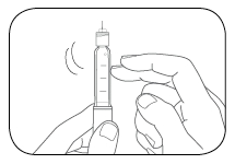 Vaihe 6: - Pidä kynää neulan kärki ylöspäin. Napauta sormella sylinteriampullin pidikettä, jotta ilmakuplat siirtyvät ylös.