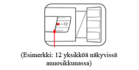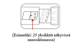 Annoslaskurin tulee osoittaa oikeaa annosta.- Kynä annostelee yhden yksikön välein.