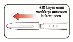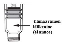 | Ylimääräinen lääkeaine: Kun olet saanut neljännen pistoksen, näet kynässä vielä ylimääräistä lääkeainetta, mikä on normaalia. Tämä ylimääräinen lääkeaine varmistaa, että kynä toimii oikein. - Hävitä kynä. - Älä yritä pistää kynässä jäljellä olevaa ylimääräistä lääkeainetta, sillä se johtaa epätäydelliseen annokseen.