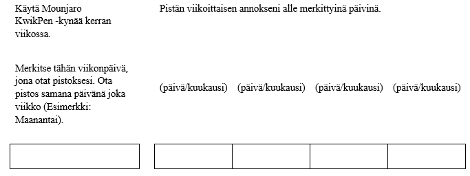 Voit tarvittaessa muuttaa viikoittaista Mounjaro‑pistospäivää, kunhan edellisestä pistoksesta on kulunut vähintään 3 vuorokautta. Kun olet valinnut uuden pistospäivän, jatka lääkkeenottoa kerran viikossa kyseisenä päivänä.