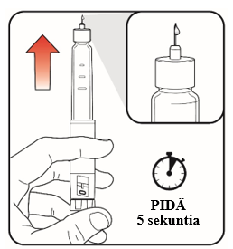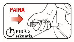 | b. Pistä lääke painamalla pistospainike pohjaan asti, jonka jälkeen laske hitaasti viiteen pitäen pistospainike alas painettuna. Kuvake tulee näkyä annosikkunassa, ennen kuin vedät neulan pois ihosta. |