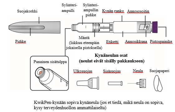 - KwikPen-kynään sopiva kynäneula (jos et tiedä, mikä neula on sopiva, kysy terveydenhuollon ammattilaiselta)