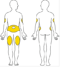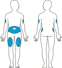 • Lääkäri, apteekkihenkilökunta tai sairaanhoitaja voi auttaa sinua valitsemaan parhaan pistoskohdan. • Voit pistää lääkkeen vatsan alueelle tai reiteen. • Toinen henkilö voi pistää lääkkeen sinulle olkavarteen. • Vaihda pistoskohtaa joka viikko. Voit pistää lääkkeen samalle alueelle, mutta valitse kyseiseltä alueelta aina eri pistoskohta. |  |