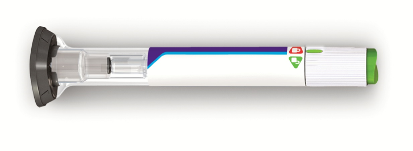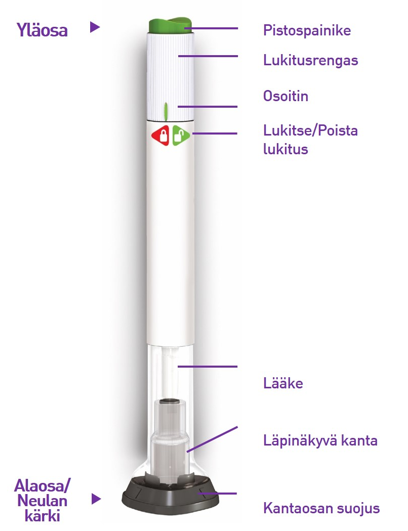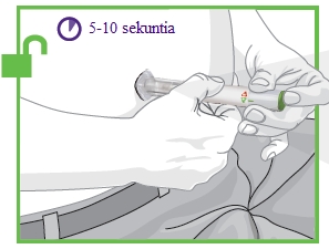 - Kun painat vihreää pistospainiketta, kynä työntää neulan automaattisesti ihoon, pistää lääkkeen ja vetää neulan takaisin sisään, kun pistos on valmis.