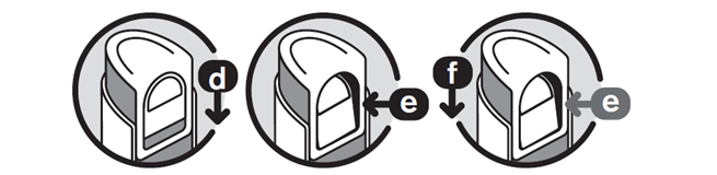 5. Liu’uta painiketta alaspäin (d), kunnes sen saa painettua sisäänpäin (e). 6. Samalla kun painat painiketta sisäänpäin, liu’uta sumuttimen pää alaspäin (f). Vapauta painike. Sumutin on nyt suljettu. |