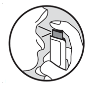 3. Suuntaa suutin avattua suutasi kohti ja pidä se mahdollisimman lähellä suuta. 4. Paina sumuttimen yläosaa lujasti annoksen vapauttamiseksi suuhun, vältä huulia. Älä hengitä sisään sumuttamisen aikana, jotta sumutetta ei joudu kurkkuun. Älä niele muutaman sekunnin aikana sumuttamisen jälkeen. |  |