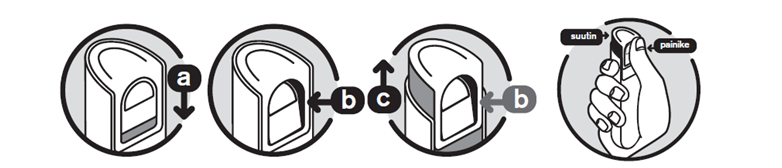 1. Liu’uta painiketta peukalolla alaspäin (a), kunnes sen saa painettua kevyesti sisäänpäin (b). Älä paina liian kovaa. 2. Samalla kun painat sisäänpäin, liu’uta peukaloa ylöspäin (c) sumuttimen yläosan avaamiseksi, ja vapauta painike. |