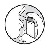 4. Paina sumuttimen yläosaa lujasti annoksen vapauttamiseksi suuhun, vältä huulia. Älä hengitä sisään sumuttamisen aikana, jotta sumutetta ei joudu kurkkuun. Älä niele muutaman sekunnin aikana sumuttamisen jälkeen.