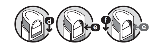 5. Liu’uta painiketta alaspäin (d), kunnes sen saa painettua sisäänpäin (e).