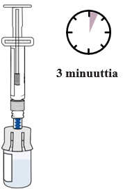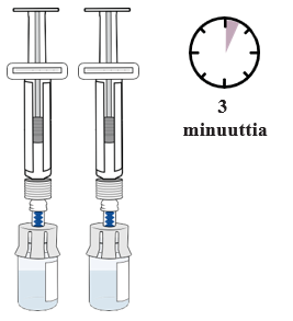 Pidä kiinni esitäytetyistä ruiskuista kummallakin kädellä ja pyörittele molempia injektiopulloja varovasti, kunnes kuiva-aine on täysin liuennut (voi kestää jopa 2 minuuttia). Älä ravista äläkä sekoita voimakkaasti.