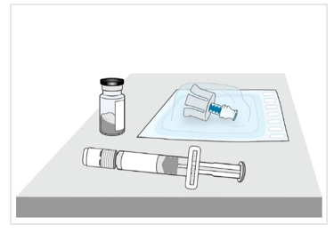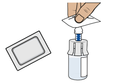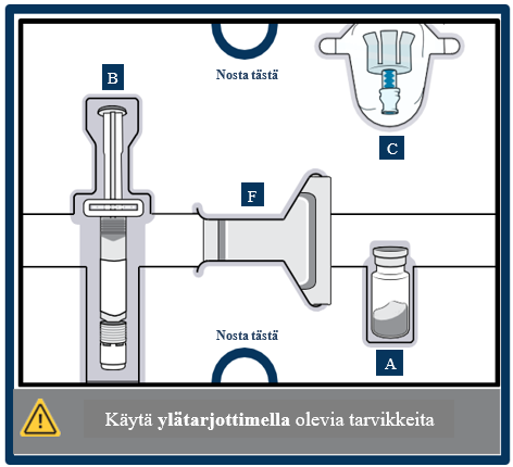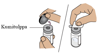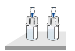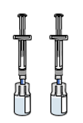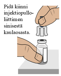 Toteuta tämä vaihe molemmille injektiopulloille. Tarkista, että molemmat injektiopullot ovat valmisteltuina, ennen kuin jatkat.