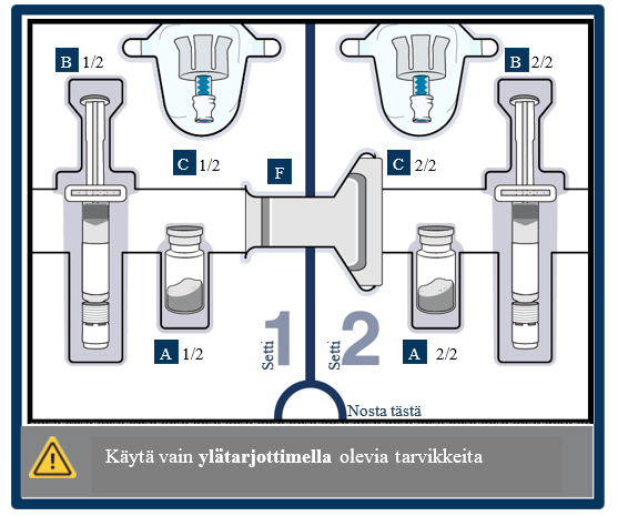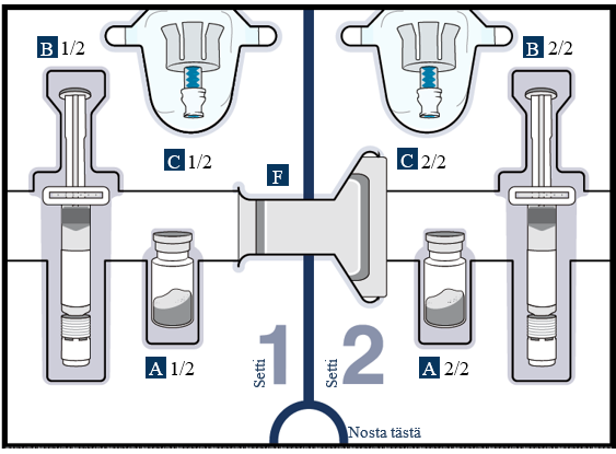 Tarkista, että sekä injektiopullo 1 että injektiopullo 2 on valmisteltu.