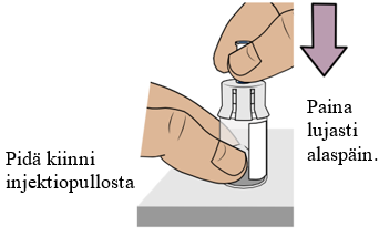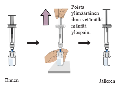 Paina kummankin injektiopullon mäntä taas alas, jotta kaikki neste menee varmasti injektiopulloon; jonkin verran nestettä on voinut joutua takaisin ruiskuun (mäntä liikkuu ylöspäin; tämä on normaalia).