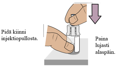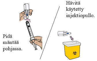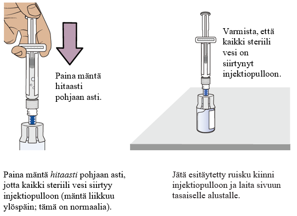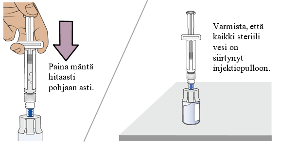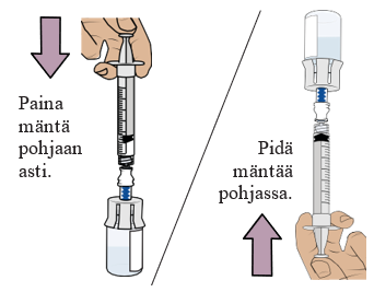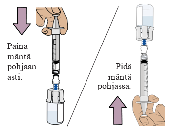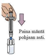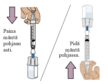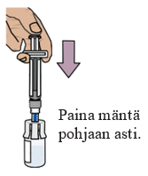 Paina mäntä hitaasti pohjaan asti, jotta kaikki lääke siirtyy injektiopulloon ja saat varmasti oikean annoksen. Näin molemmissa injektiopulloissa ollut lääke saadaan yhdistettyä.