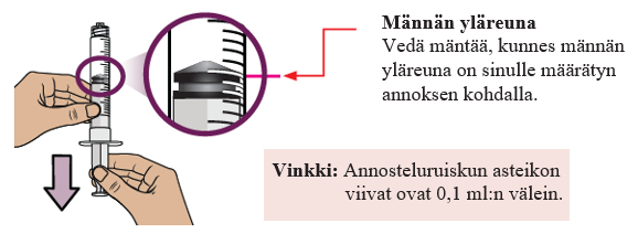 Näin varmistat, että kaikki injektiopullossa ollut lääke on annosteluruiskussa.
