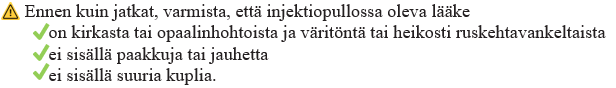 Älä käytä lääkettä, jos olet pyöritellyt lääkeinjektiopulloa noin 2 minuutin ajan ja antanut sen seistä vielä 3 minuuttia, mutta lääkkeessä näkyy edelleen sameutta, paakkuja, jauhetta tai hiukkasia. Ota yhteyttä lääkäriin tai apteekkihenkilökuntaan ja pyydä uusi pakkaus.