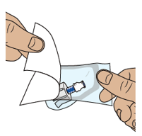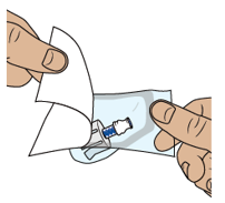 Ota 2 uutta antiseptistä pyyhettä alatarjottimelta ja puhdista niillä injektiopulloliittimien yläosat.