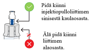 Pidä kiinni injektiopulloliittimestä ja irrota täytetty annosteluruisku injektiopullosta kiertämällä.
