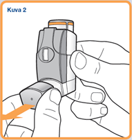 Jos kätesi ovat heikot, voi olla helpompaa pitää kiinni inhalaattorista molemmin käsin eli asettaa molemmat etusormet aerosolipullon päälle ja molemmat peukalot inhalaattorin pohjan alle.