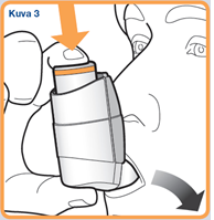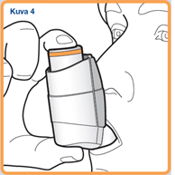 5. Hengitä sisään hitaasti ja syvään suun kautta ja paina samalla aerosolipulloa, jolloin inhalaattorista vapautuu yhteen inhalaatioon tarvittava lääkemäärä. Hengitä edelleen sisään tasaisesti ja syvään (lapset mieluiten noin 2–3 sekuntia ja aikuiset 4–5 sekuntia).