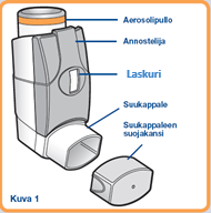 Lue tämä seloste huolellisesti ennen käyttöä ja noudata jäljempänä olevia ohjeita ja kaavioita. Lääkäri tai apteekkihenkilökunta näyttää sinulle, miten inhalaattoria käytetään oikein. Lääke on aerosolipullossa (ks. kuva 1), joka on pakattu muoviseen annostelijaan. Annostelijassa on myös laskuri, joka kertoo, kuinka monta inhalaatiota on jäljellä, kun laite on valmisteltu käyttökuntoon. Laskuri on värikoodattu. Ensin se on vihreä, sitten se muuttuu keltaiseksi, kun jäljellä on alle 50 inhalaatiota, ja lopulta punaiseksi, kun jäljellä on alle 30 inhalaatiota. Kun laskuri lähestyy nollaa, ota yhteys lääkäriisi saadaksesi uuden inhalaattorin. Älä käytä inhalaattoria, jos laskurissa näkyvä luku on 0.