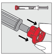 | Vaihe 2 Vedä punainen korkki irti ruiskun päästä ja hävitä korkki turvallisesti. |