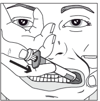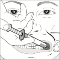 | Vaihe 4 Paina ruiskun mäntää hitaasti, kunnes mäntä pysähtyy. Koko liuosmäärä annetaan hitaasti ikenen ja posken väliseen tilaan. Voit antaa lääkärin määräyksen mukaisesti (suurempia annoksia ja/tai pienemmille potilaille) noin puolet annoksesta hitaasti toiselle puolelle potilaan suuta ja sen jälkeen hitaasti toiselle puolelle. |