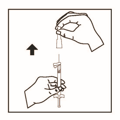 5. Vedä neulansuojus pois neulasta vetämällä sitä suoraan. Älä kierrä neulansuojusta, koska neula saattaa irrota ruiskusta.