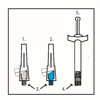 4. Vedä turvaneulan suojapussi auki puoleen väliin. Pitele neulaa suojapussia suojana käyttäen. Kiinnitä turvaneula ruiskun luer-liittimeen sujuvalla, myötäpäivään kiertävällä liikkeellä.