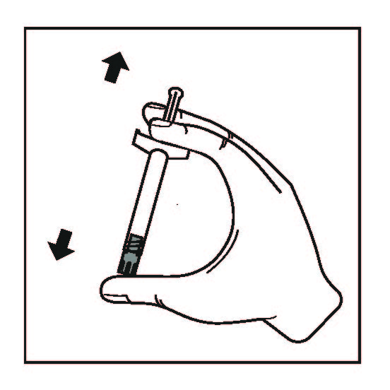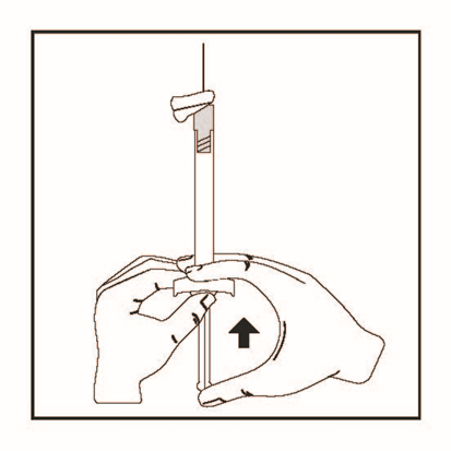 6. Käännä ruisku ja neula pystysuoraan asentoon ylöspäin ja poista ilma ruiskusta. Poista ilma ruiskusta painamalla mäntää varovasti sisäänpäin.