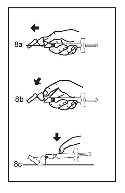 8. Kun injektio on annettu, paina neulaa peukalolla tai toisen käden sormella (8a, 8b) tai tasaista alustaa (8c) vasten aktivoidaksesi neulansuojuslaitteen. Laitteesta kuuluu naksahdus, kun se on kiinnittynyt. Hävitä ruisku ja neula asianmukaisesti.
