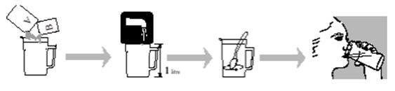 - Lisää vettä mitta-astiaan yhden litran merkkiin asti ja sekoita, kunnes jauhe on liuennut kokonaan ja Moviprep-liuos on kirkasta tai hieman sameaa. Tämä vie korkeintaan 5 minuuttia.