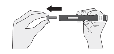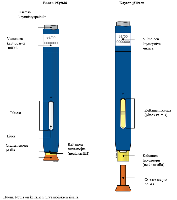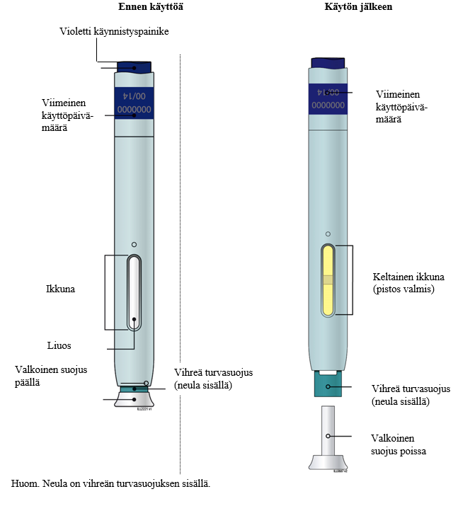 Vasta kun olet valmis pistämään lääkkeen, vedä suojus suoraan pois. Pistos on annettava 5 minuutin kuluessa tästä. Neulan kärjessä tai turvasuojuksessa voi näkyä nestepisara, mikä on normaalia.