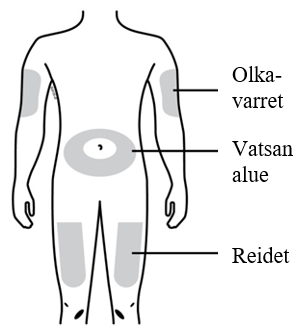 - Älä valitse kohtaa, jossa iho on arka, mustelmilla, punoittaa tai tuntuu kovalta. Vältä pistämästä kohtiin, joissa on arpikudosta tai arpijuovia (raskausarpia).