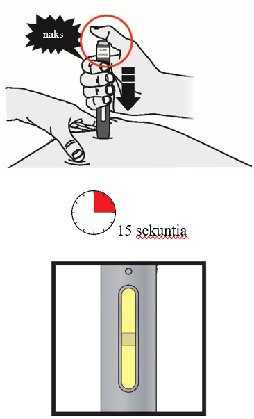 - Jos ikkuna ei ole muuttunut keltaiseksi tai jos lääkettä näyttää yhä siirtyvän kynästä, kun vedät kynän pois iholta, et ole saanut koko annosta. Ota välittömästi yhteys lääkäriisi.