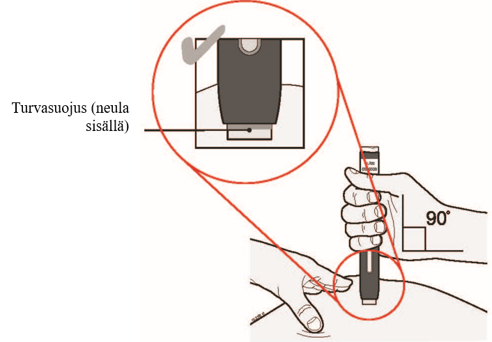 Pidä iho kiristettynä/ poimulla. Aseta kynän turvasuojus (ilman suojusta) iholle 90 asteen kulmassa. Neula on turvasuojuksen sisällä.