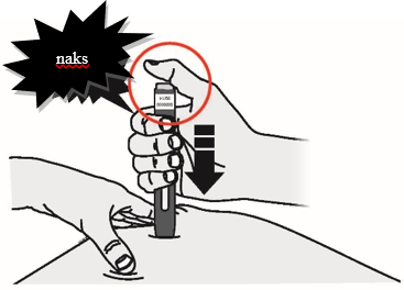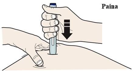 Huom. Kynä on painettava kokonaan ihoa vasten, mutta käynnistyspainiketta ei saa painaa, ennen kuin olet valmis pistämään lääkkeen.