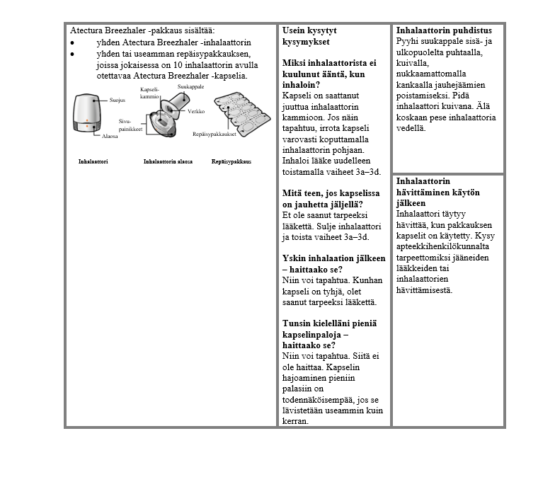 Jos sinulla on kysyttävää Atectura Breezhaler -valmisteen vaikutuksesta tai siitä, miksi sinulle on määrätty tätä lääkettä, käänny lääkärisi puoleen.