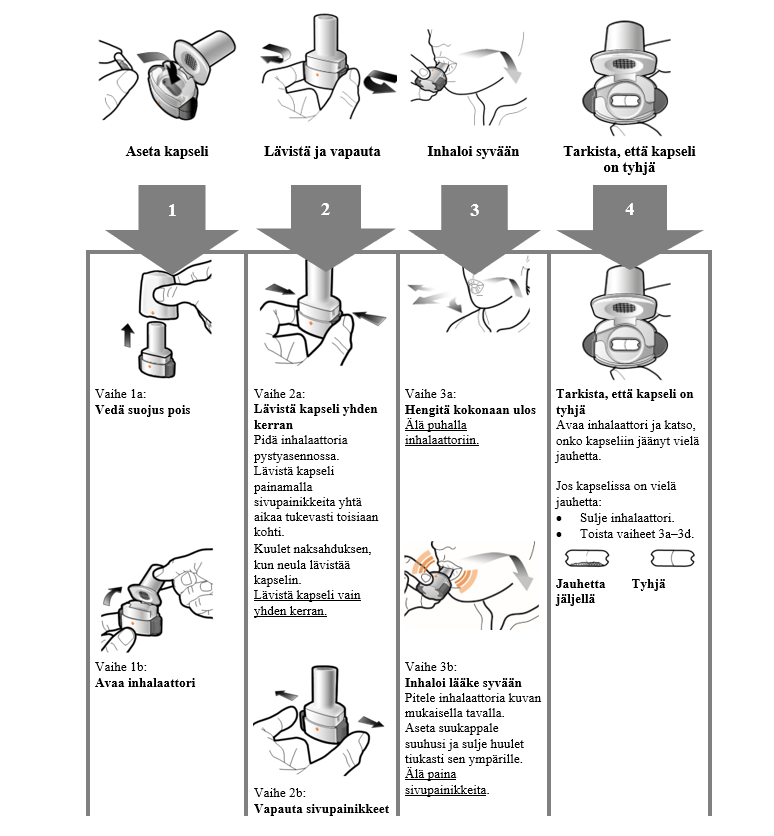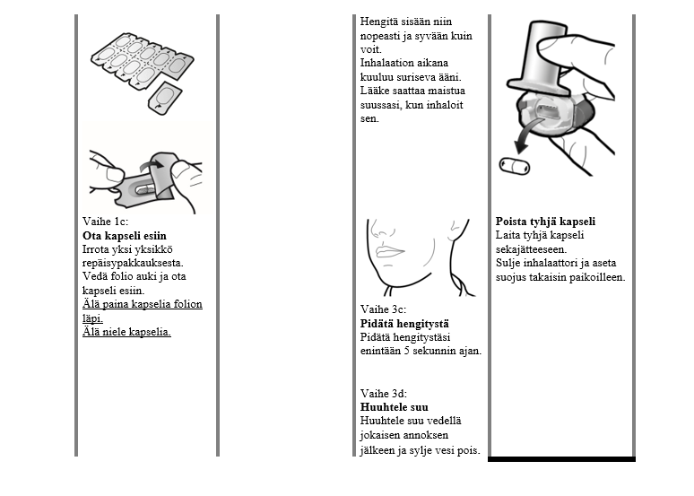 - Pakkauksessa on inhalaattori ja kapseleita, joihin lääke on pakattu. Inhalaattoria käytetään kapselin sisältämän lääkkeen inhaloimiseen. Inhaloi kapselit aina pakkauksessa olevan inhalaattorin avulla. Poista kapselit repäisypakkauksesta vasta juuri ennen niiden käyttöä.