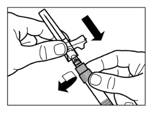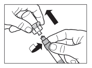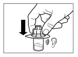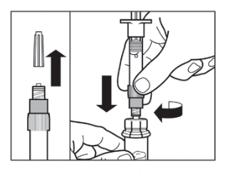 - Tartu adapteripakkaukseen, aseta se injektiopullon päälle ja paina napakasti, kunnes se kiinnittyy injektiopulloon. Adapterin kiinnittyessä kuuluu ”napsahtava” ääni.