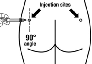 - Pistä neula kokonaan potilaan oikeaan tai vasempaan pakaralihakseen ihoon nähden 90 asteen kulmassa.