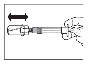 - HUOM: Pidä mäntä sisäänpainettuna ja ravista injektiopulloa maltillisesti vaakasuunnassa vähintään 30 sekunnin ajan, jotta kuiva-aine ja liuotin sekoittuvat täysin (maitomainen tasa-aineinen suspensio). Toista 30 sekunnin maltillinen ravistelu, jos kuiva-aine ja liuotin eivät ole vielä täysin sekoittuneet.